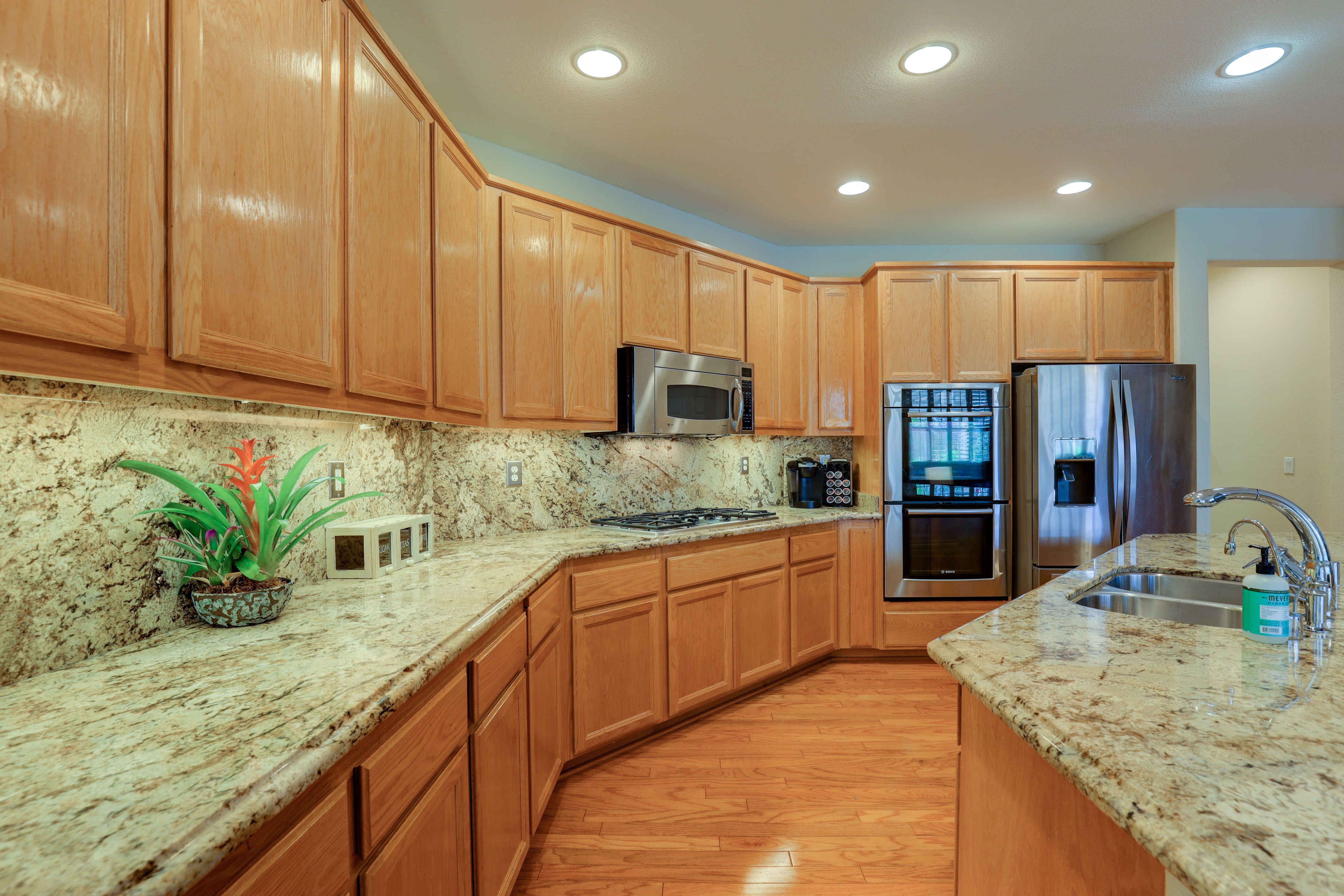Beautiful Granite countertops with OGEE edges, large granite backsplash from counter to cabinet, top of the line Bosch appliances. All you would hope for in an open concept kitchen.