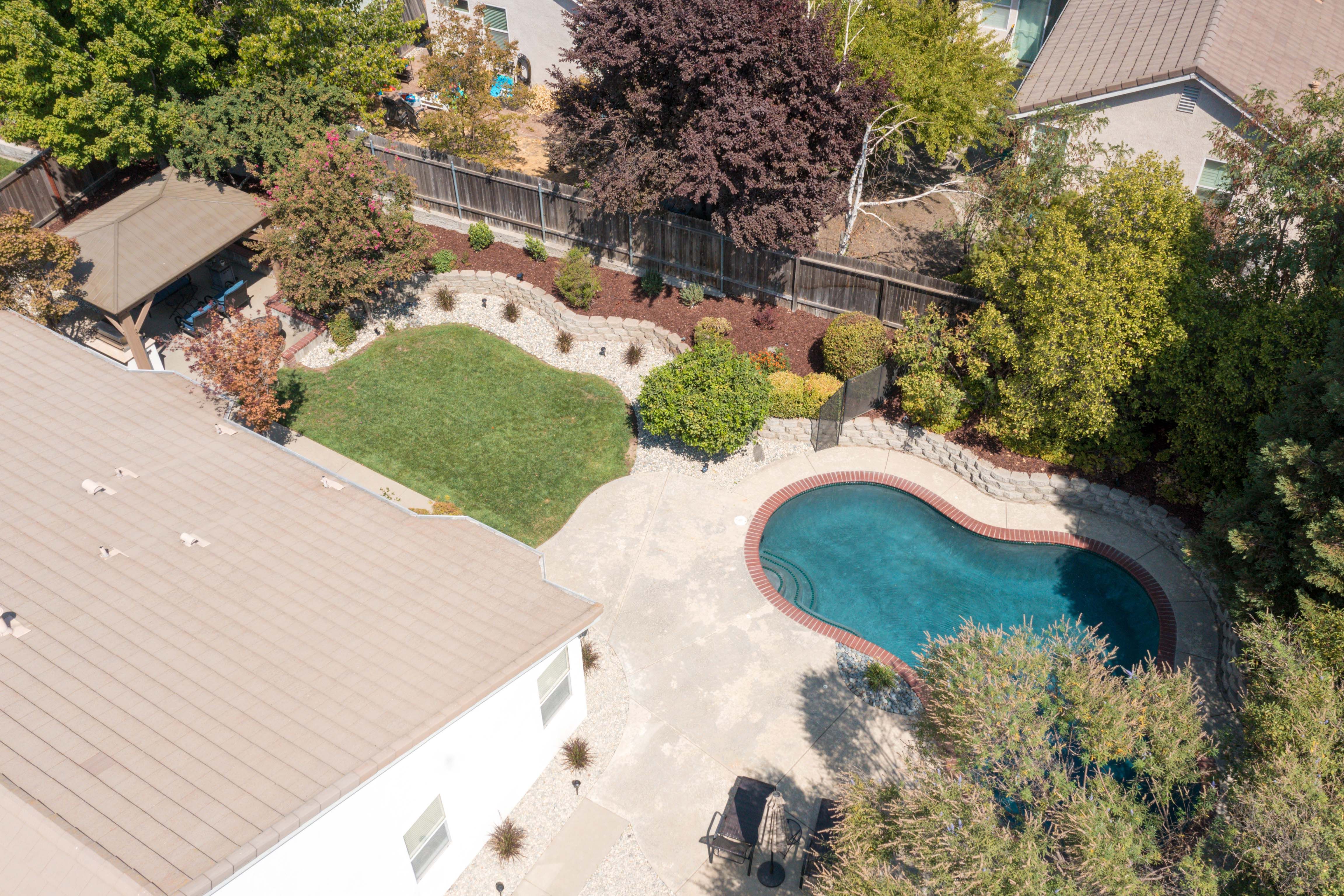 Spacious, green backyard - always something blooming! It's spread out perfectly to fulfill all needs. Relax under the pergola while grilling something up on the built-in BBQ, play catch with the dog on the grassy area, or take a dip in the refreshing, large swimming pool that's tucked in the corner of this sprawling backyard.